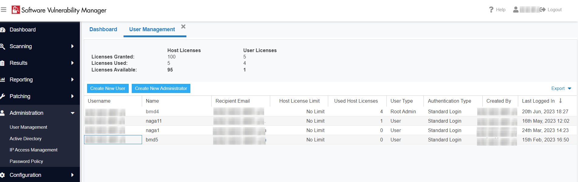 Software Vulnerability Manager (Cloud Edition) Help LibraryAdministrationUser ManagementUser Management Use this page to administer your Software Vulnerability Manager users. Create a New Administrator Create a New User