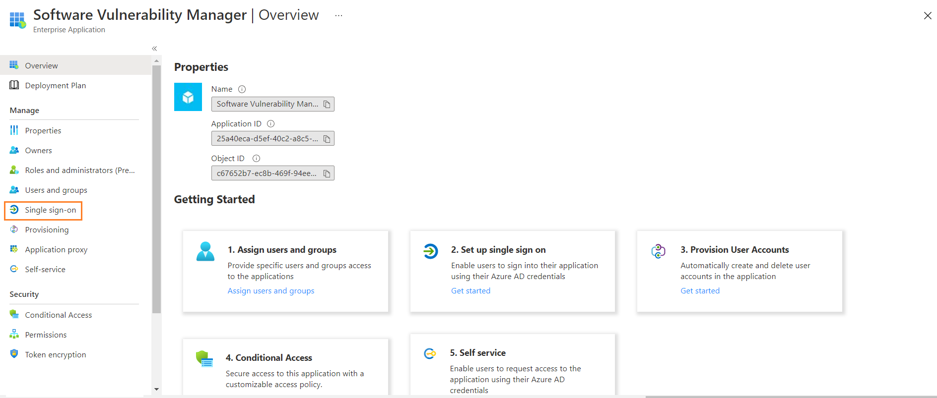 On the application account details page, select Single sign-on from the left panel. You can also select from the Overview page by clicking Get started link.