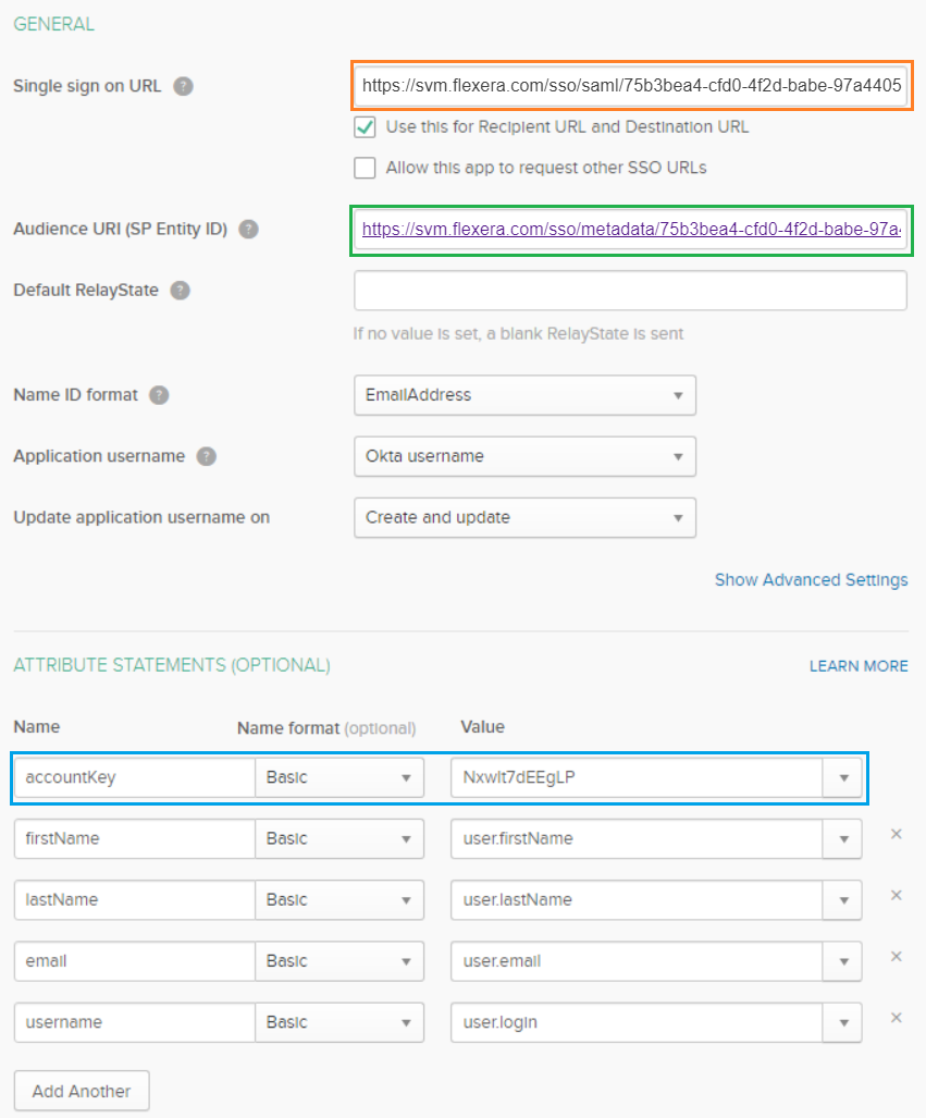 Copy the following from the Software Vulnerability Manager Configuration > Settings fields and paste in the Okta SAML Settings > fields: