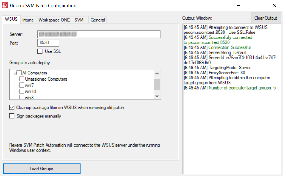 In WSUS Connection tab, enter the WSUS server details and the port number, click Load Groups.