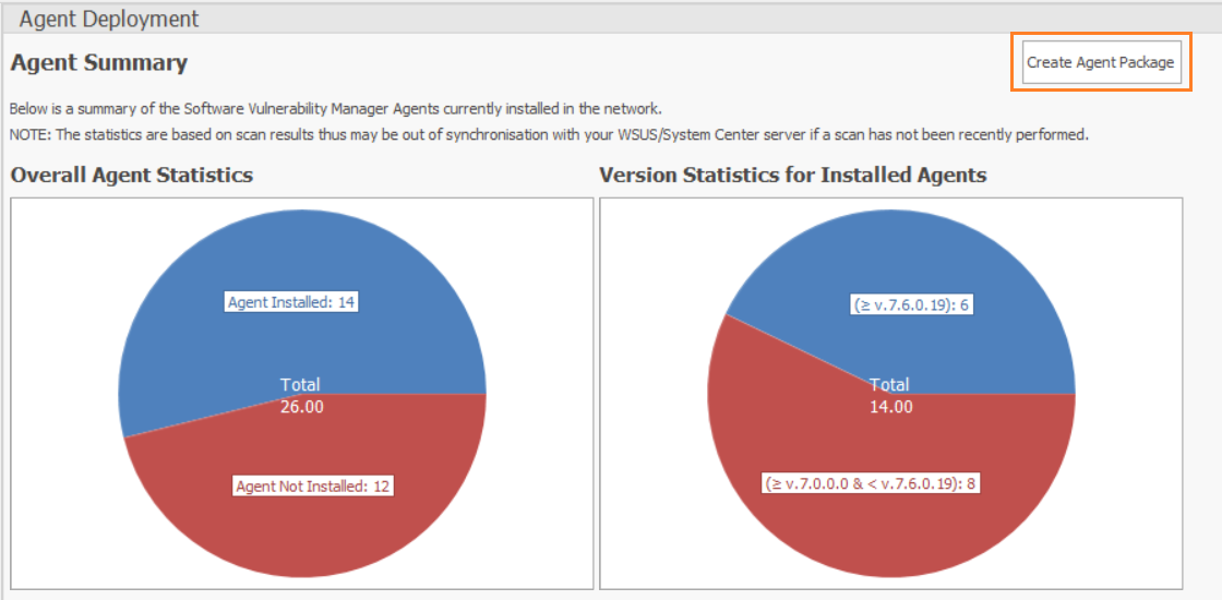 Agent Deployment view gives summary of the Software Vulnerability Manager agents currently installed on the endpoints in the network. You can also create and publish the agent to the configured endpoint management system for deployment.