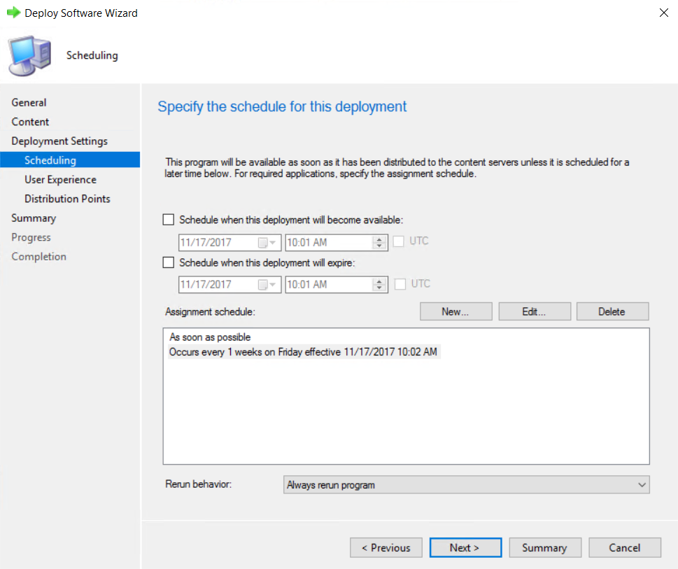 On the Scheduling page, in the Assignment schedule click New. Schedule a scan for as soon as possible and create a weekly scanning schedule. Also configure the Rerun behavior deployment to Always rerun program.