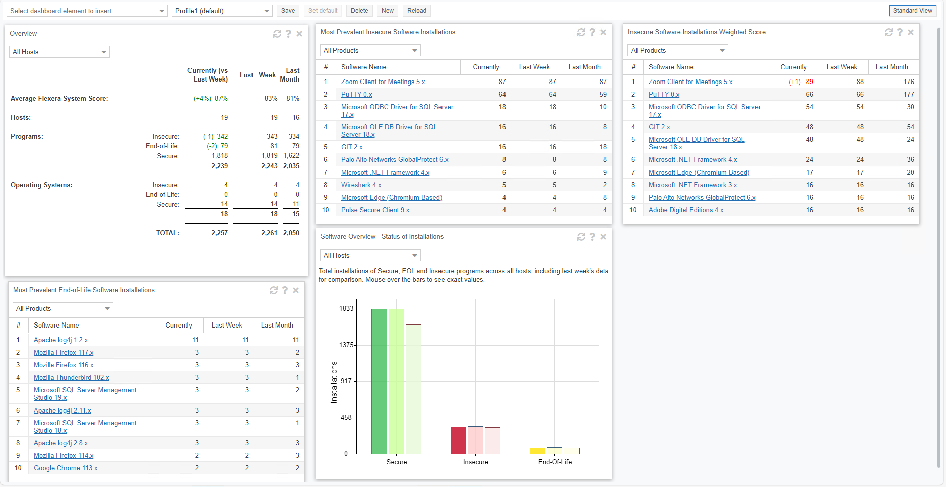 The first time you login to the Software Vulnerability Manager console the Dashboard page will only display the Overview portlet. Select the Dashboard elements you want to view from the drop-down list on the upper left of the page. You can then either save the profile or, if you have created several profiles, set it as the default profile. You can also delete, add a new profile or reload the current profile view.